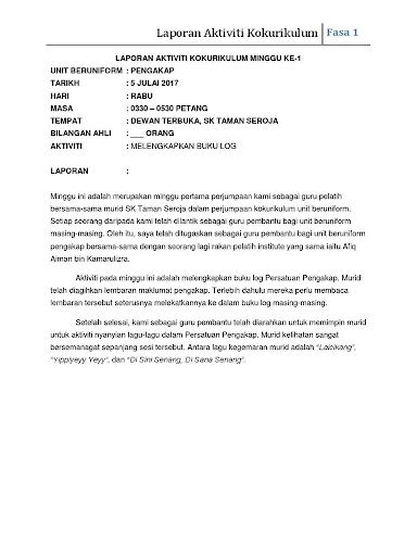 Setiap pelajar wajib menyertai aktiviti kokurikulum seperti berikut: Contoh program perjumpaan mingguan pengakap masa 300 petang . Persatuan/ kelab, unit pakaian seragam dan kelab sukan/permainan : Laporan aktiviti mingguan kor kadet polis tarikh tempat kehadiran kehadiran guru: Persatuan/ kelab, unit pakaian seragam dan kelab sukan/permainan :